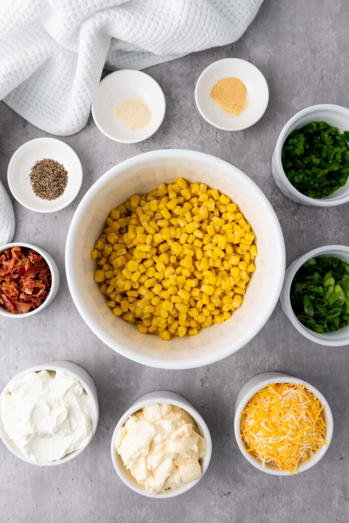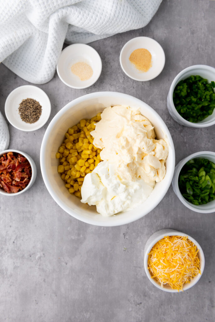 Drain the corn. Make sure all liquid is drained. In a medium-large bowl, add the corn, sour cream, mayonnaise, shredded cheese, chopped bacon, chopped scallions, chopped jalapeno and seasoning. Mix until well combined.