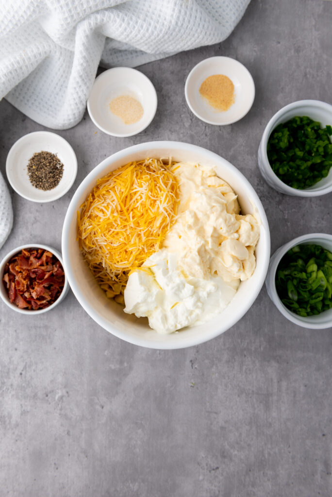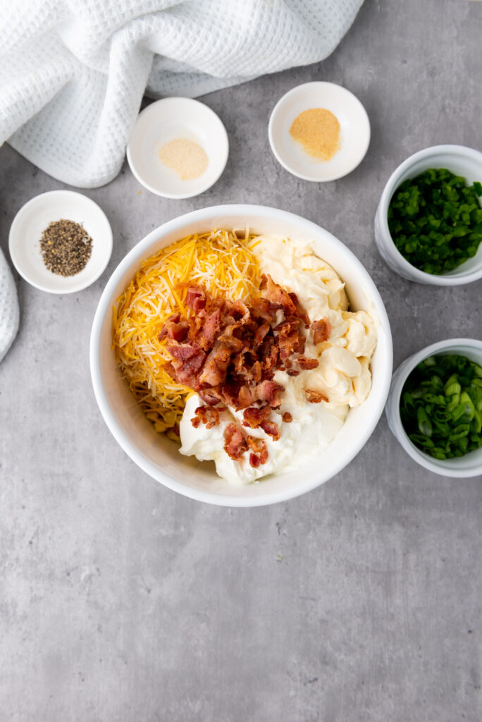 Cook the bacon until crispy so it adds texture to the dip rather than becoming soft. Adjust seasoning at the end, especially salt, since bacon and cheese already add saltiness.