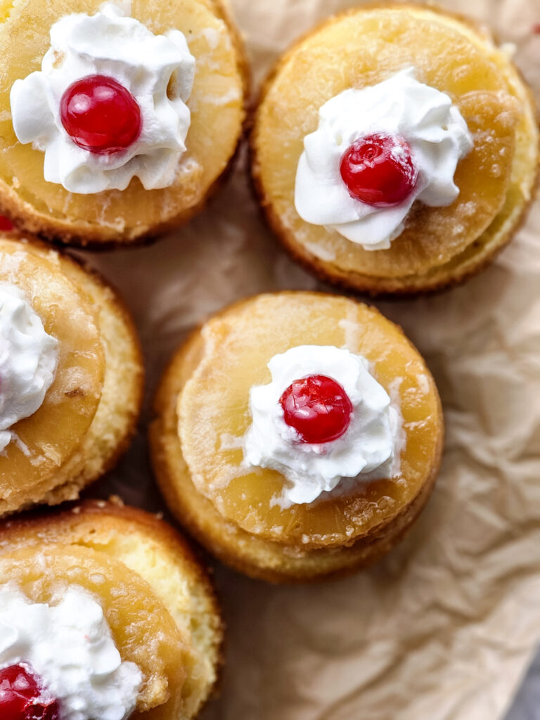 - Once the mini pineapple upside down cakes are done, let cool completely. Flip the muffin pan onto a clean surface covered with parchment paper and gently tap the bottom of the pan to release the cakes.