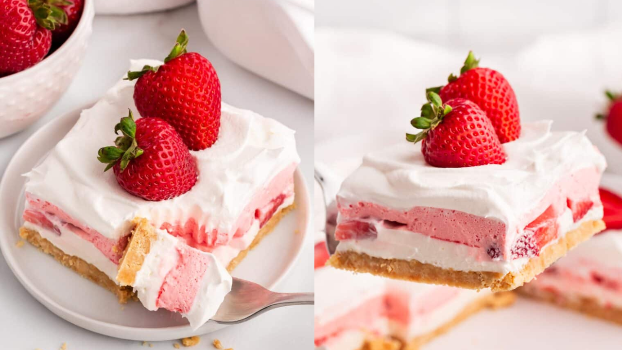 This strawberry lasagna is a no-bake dessert recipe made with four delicious layers. A golden Oreo crust, cheesecake with fresh strawberries, creamy strawberry jello and whipped topping!
