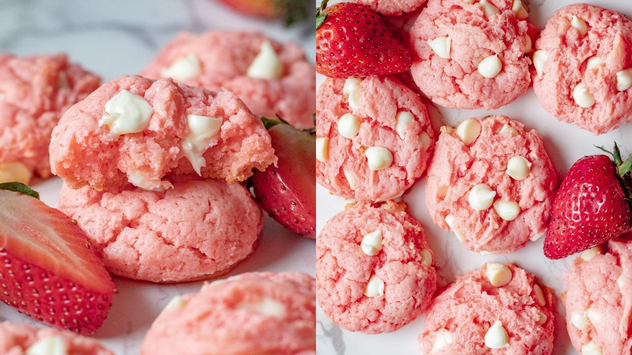 These strawberry cheesecake cookies with white chocolate chips are the perfect sweet treat! How to make strawberry cheesecake cookies from cake mix that are so easy and delicious!