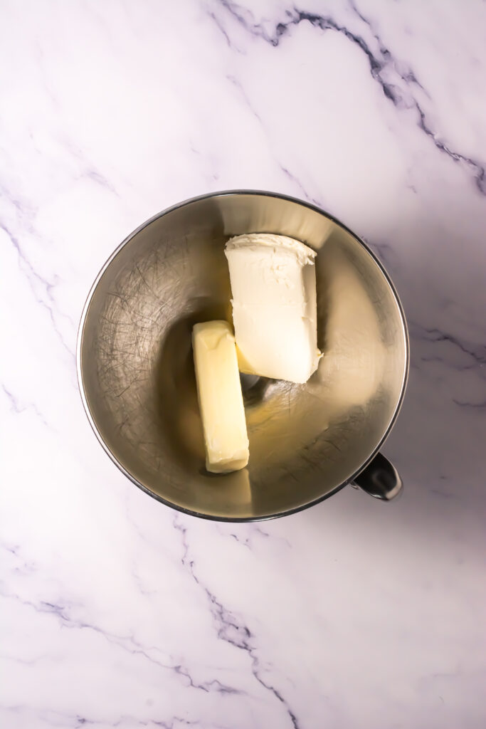 For the filling – in the bowl of a stand mixer, combine the softened cream cheese and butter. Cream until smooth.