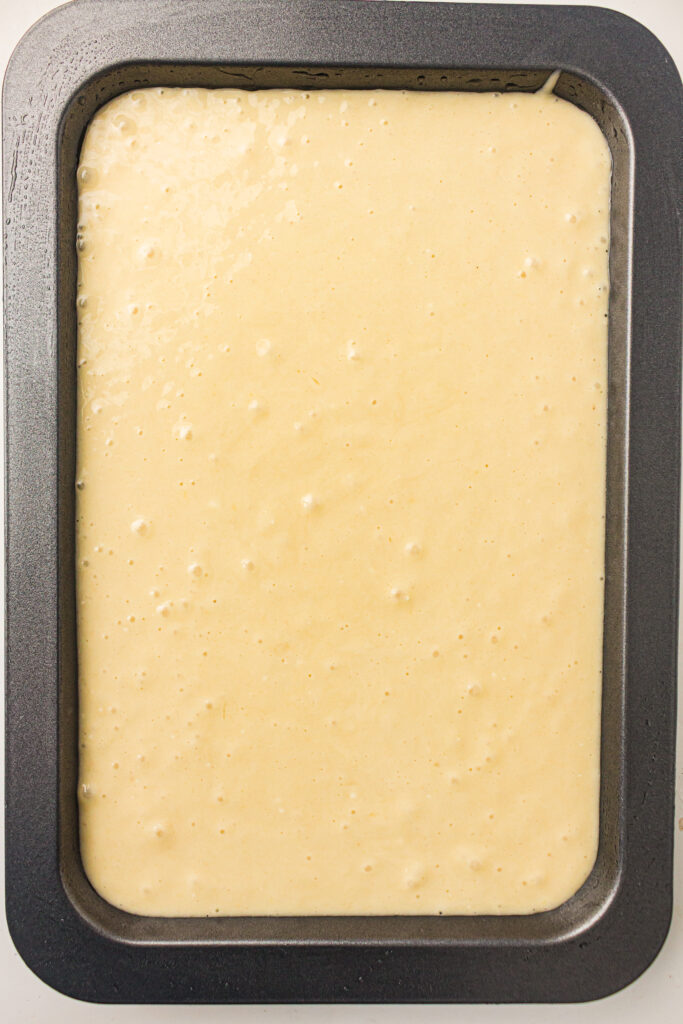 Pour the batter into a greased deep 9×13-inch baking dish (23×33 cm). Bake according to package directions until fully cooked.