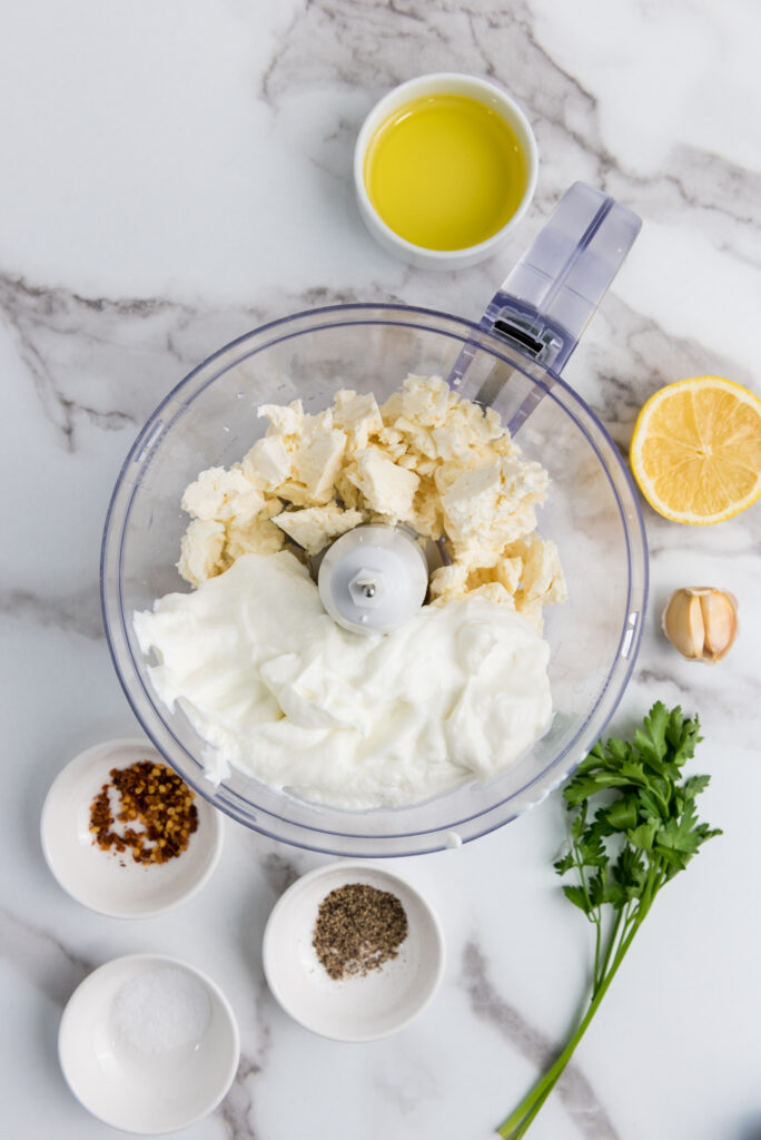 In a food processor, add the feta cheese, yogurt, olive oil, garlic, salt and pepper. Process until well combined.